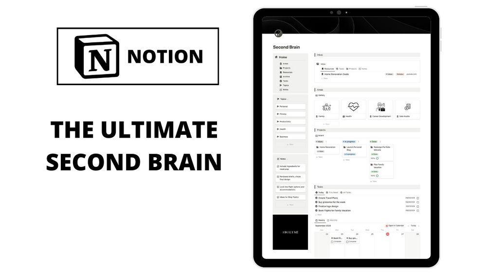 Boost your productivity and stay organized with the powerful Second Brain Notion Template. Designed for busy individuals looking to streamline their life, this all-in-one workspace helps you manage your tasks, projects, notes, and areas efficiently.