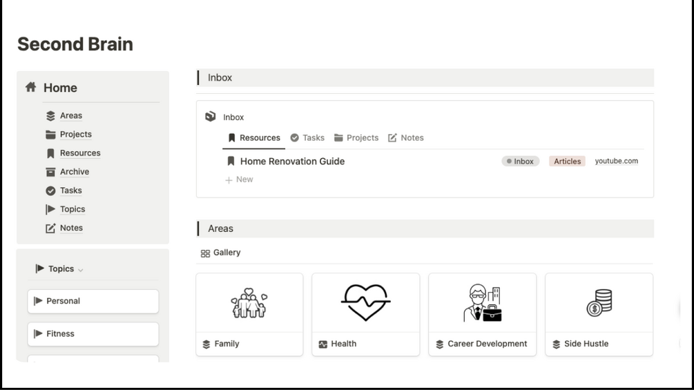 - Inbox for Quick Capture: Easily jot down tasks, resources, projects, and notes. Quickly capture everything that comes to mind to process later.