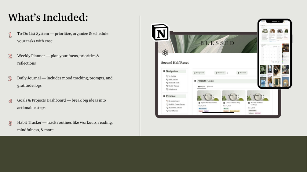 This all-in-one Notion Life Planner blends wellness, productivity, and creativity to help you stay grounded, inspired, and on track.